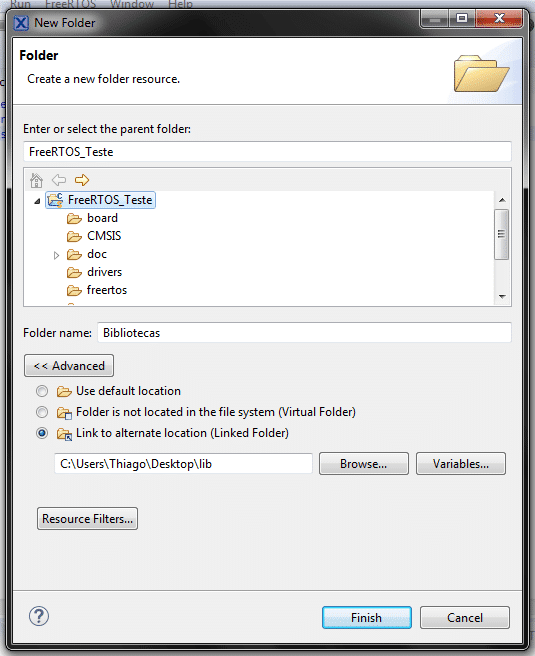 A inclusão das bibliotecas externas para os periféricos deve ser feita adicionando os arquivos .c que necessitam ser compilados a pasta dentro do projeto de forma linkada. Para isso, clique com o botão direito sobre o projeto New → Folder. Clique no projeto e dê um nome para a pasta que conterá os arquivos a serem incluídos. Em “Advanced”, faça com que esta pasta seja uma “Linked Folder”. Digite seu endereço e clique em Finish.