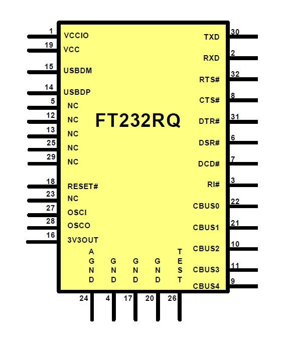 O FT232R é um chip conversor USB – UART que usa seus pinos TXD e RXD para transmitir dados recebidos pela USB ou para transmitir dados para ela. Ele pode ser alimentado com tensões de 3,3V a 5,25V, geralmente para isso é utilizada a tensão disponível pela porta USB (5V). Um ponto muito importante do chip é que ele tem o um pino chamado VCCIO, que deve ser alimentado com a tensão a ser usada nos pinos de interface serial e no barramento CBUS (que será explicado mais adiante). O pino VCCIO pode ser alimentado com tensões de 1,8V a 5,25V. Em outras palavras, VCCIO vai compatibilizar o nível de tensão nos pinos TX e RX com o microcontrolador, que geralmente usa 5V ou 3,3V. Para fazer a comunicação com nível de 5V basta ligar VCCIO ao 5V da USB. Já para um nível de 3,3V, o FT232R conta com um regulador interno do tipo LDO que disponibiliza essa tensão em um pino, o 3V3OUT. Para usar outro nível de tensão é necessário um regulador externo adicional.
