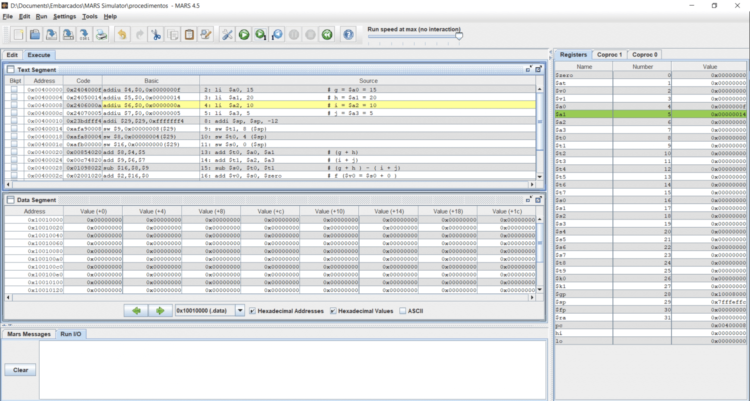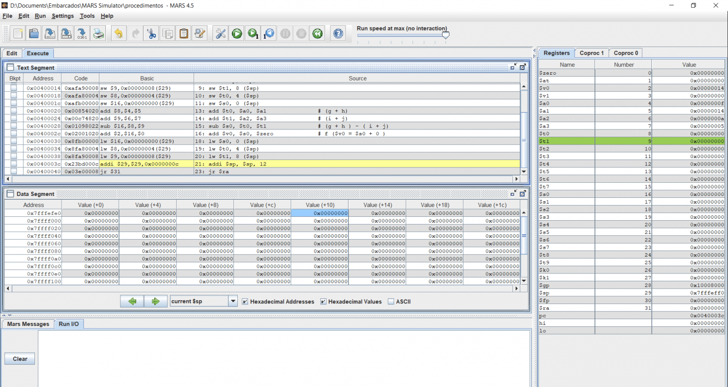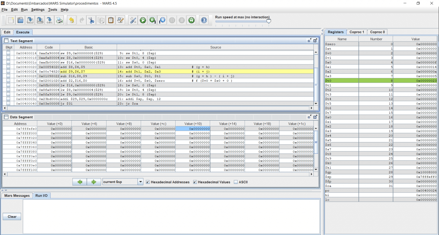 Assim encerramos a compilação de uma função em C para o Assembly MIPS. Importante ressaltar que $s0 a $s7 são preservados em uma chamada de procedimento enquanto que registradores de $t0 a $t9 não são. O código completo para o MARS fica da seguinte forma: