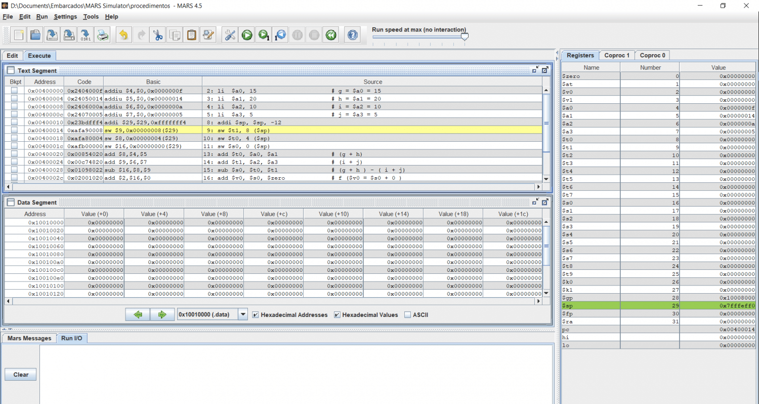 Teste o código no MARS e verifique o resultado. Abaixo seguem prints de tela da execução no meu computador para você se guiar.