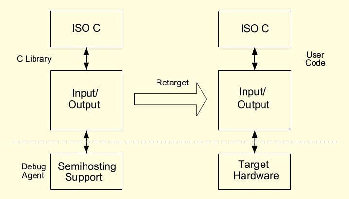 Essas funções de suporte podem ser reimplementadas pelo desenvolvedor a fim de que essa interface seja realizada por meio de um agente de debug, instalado na máquina host. Esse tipo de implementação é chamado de semihosting, e é mostrada na Figura 1. Além disso, tais funções podem ser implementadas de acordo com o hardware disponível, como, por exemplo, envio/recepção de dados pela porta serial, como mostrado na Figura 2.