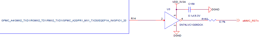 O circuito integrado SN74LVC1G06DCK (U3) também é alimentado pelo LDO4. Trata-se de um inversor open-drain, responsável por gerar o sinal de reset para a memória eMMC do dispositivo. A referência de nível alto para este sinal é dado por R111, fornecido por outra fonte de alimentação, conforme veremos mais adiante.