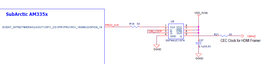 A alimentação VDD_3V3A também alimenta o SN74AUC1G74 (U6). Este componente é um flip-flop do tipo D, configurado especificamente para fazer a divisão do clock. Dessa forma, a saída terá duty-cycle de 50%. Esse sinal é especificamente para o circuito do HDMI.