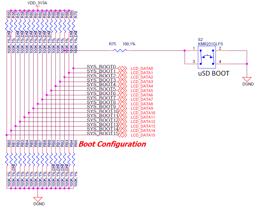 Outro bloco fundamental alimentado pelo VDD_3V3A é a configuração de BOOT do sistema. Tratam-se de resistores de pull-up e pull-down que, de acordo com sua configuração montado/não-montado determinam por qual dispositivo o sistema vai inicializar. Nesse momento, nossa análise está se preocupando apenas em conhecer os pontos alimentados por cada canal dos reguladores. Dessa forma, deixaremos para avaliar o que cada resistor define nessa configuração em um momento futuro.