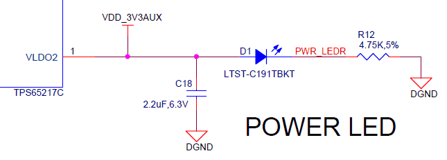 Nas primeiras versões de placa, essa tensão era utilizada como enable para a saída de VDD_3V3B, posteriormente alterada para o próprio VDD_3V3A por questões de sincronismo, como vimos. A única carga presente nele é um LED azul (LTST-C191TBKT), e mesmo esse sofreu alterações. O resistor R12 foi alterado de 820R para 4,75K para diminuir o brilho. O esquema de saída desse circuito é dado conforme segue:
