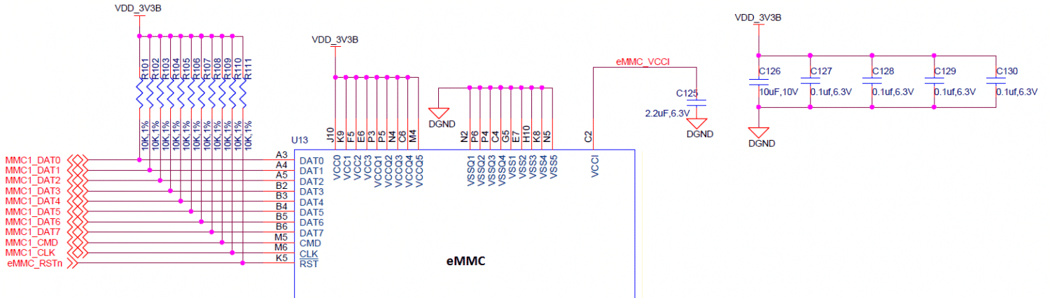 Para o nosso circuito, tanto VCC quanto VCCQ estão ligados na mesma alimentação de VDD_3V3B. Para VCCI, verificamos que foi adotado um capacitor de 2,2uF, o C125.
