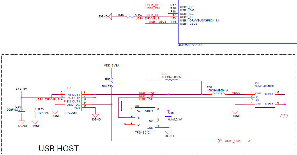 Ele também possui um limitador de corrente interno de 500mA. No caso de um curto-circuito ou sobre-corrente, o sistema limita esse valor e indica a informação através de uma saída dreno-aberto. No nosso caso, essa saída é passada para o núcleo através do sinal USB1_OCn, fazendo uso de R52 como resistor de pull-up.
