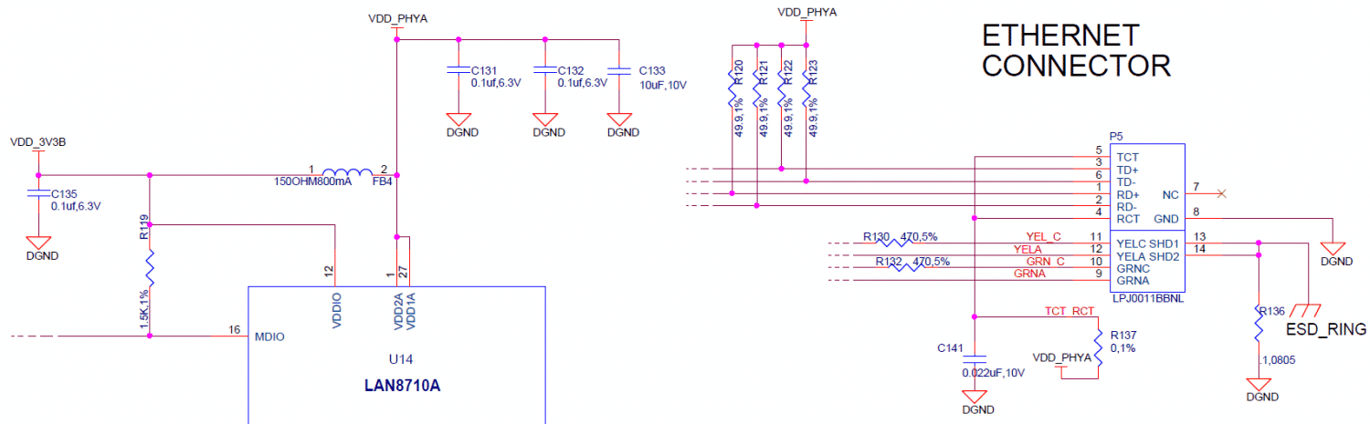 Trata-se da alimentação dos dispositivos responsáveis pela Ethernet de nossa plataforma, principalmente o LAN8710A (U14). É derivada de VDD_3V3B, passando pelo indutor FB4. Essa tensão também alimenta o ponto central do transformador de rede para RX e TX, através do resistor R137.