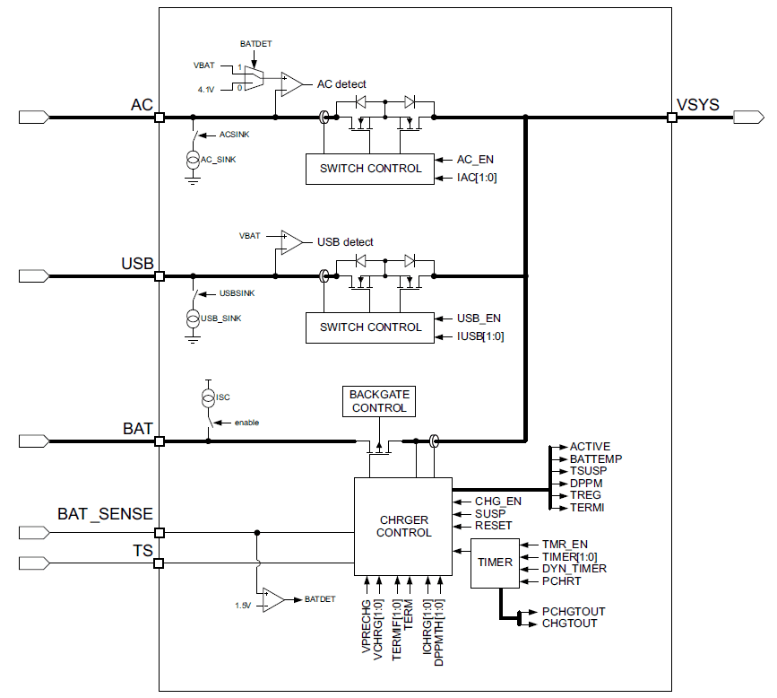 Através desse barramento é possível fazer o controle do Power Path, através do registrador 01h (PPATH). É possível ligar ou desligar uma entrada, como USB ou AC, ou mesmo indicar a corrente máxima que será solicitada de cada uma das entradas, chegando a 2500mA para a entrada AC, e 1800mA para a USB.