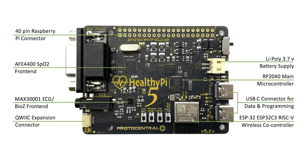 Com uma configuração inovadora de dois microcontroladores, incluindo um RP2040 Cortex-M0+ de dois núcleos e 32 bits, juntamente com um módulo ESP32 C3 RISC-V, o HealthyPi 5 é adequado para uma ampla gama de aplicações, incluindo aquelas que envolvem aprendizado de máquina e sinais fisiológicos. Além disso, com conectividade Wi-Fi e BLE, é fácil conectar seu aplicativo a outros dispositivos e à internet.