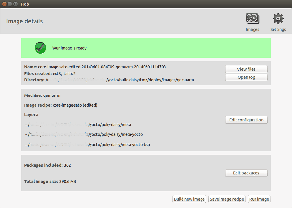 O HOB através de interface gráfica nos permite configurar, construir, criar novas imagens, testar e utilizar o QEMU de maneira bastante simplificada e direta. Porém, infelizmente ele não possui todas as ferramentas necessárias para se utilizar o Yocto de maneira avançada. Não conseguimos, por exemplo, criar ou editar uma receita de um pacote em específico.