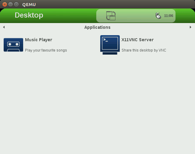 Aproveite para explorar a imagem e note que existem diversas aplicações inclusas. Você pode inclusive se conectar ao qemu via VNC.