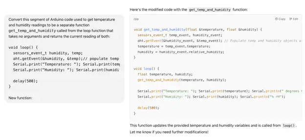 Em segundo lugar, solicite que a IA modifique partes de códigos existentes, como sketches anteriores, para adaptá-los ao projeto atual. Essa abordagem também pode ser usada para otimizar o código, transformando trechos em funções reutilizáveis e garantindo que as solicitações de geração de código considerem restrições de hardware — por exemplo, o microcontrolador utilizado (como Arduino Uno versus ESP32) e limitações de energia, memória ou pinos. Isso assegura que o código gerado seja otimizado para a placa utilizada e evita o uso de funções incompatíveis com certas arquiteturas.