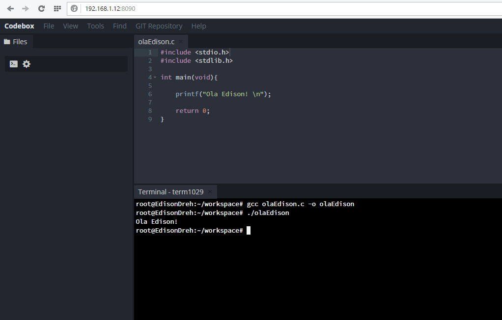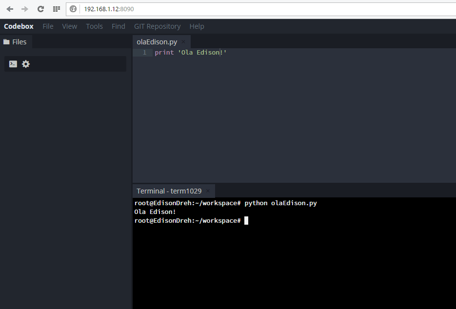 Com o diretório criado, iniciei então o Codebox em minha Intel Edison por meio do seguinte comando: