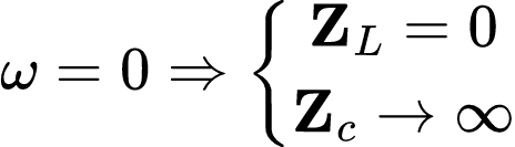 Onde, ω=0 significa um circuito com fontes CC. Nesse caso temos o comportamento já estudado: o indutor atua como um curto-circuito, já o capacitor opera como um circuito aberto.