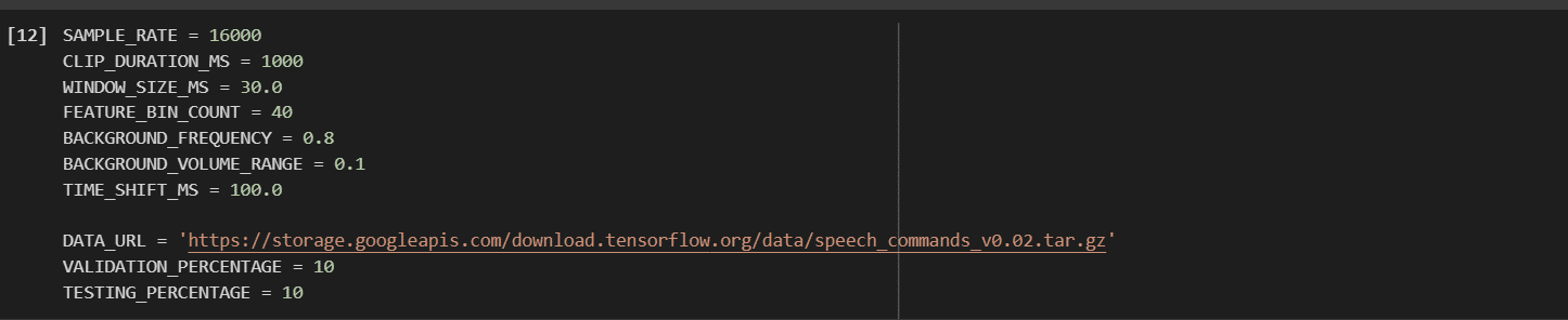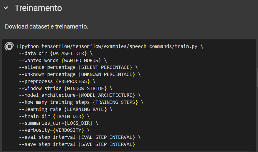 Depois, são configurados alguns parâmetros importantes para o treinamento do modelo de reconhecimento de comandos de voz. Primeiro, é especificado o diretório onde os dados de áudio (dataset) estarão localizados. Também são definidas as palavras que o modelo deve aprender a reconhecer, além da porcentagem de áudio que será classificada como “silêncio” e “desconhecido”. Em seguida, é determinado o tipo de pré-processamento a ser aplicado aos dados de áudio e o valor do deslocamento da janela de análise do áudio, que define a quantidade de sobreposição entre as janelas de análise durante a extração das características do áudio.