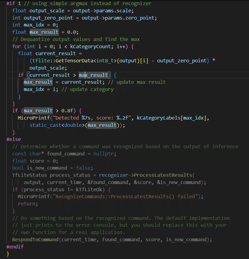 7. Acesse novamente o arquivo main_functions.cc, localize a linha 161 dentro do void loop. Nessa parte do código, há uma decisão sobre o uso do método argmax em vez do recognizer.