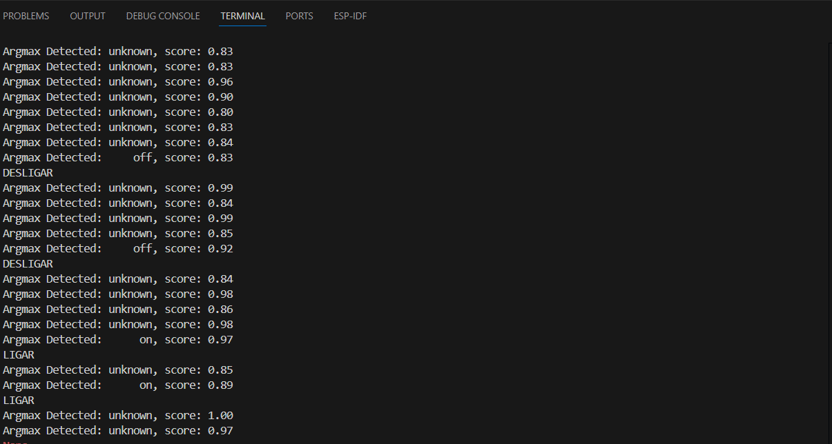 Após realizar as modificações, grave o código na placa e abra o monitor serial. Será exibida a palavra com o maior score identificado. Caso seja uma palavra desconhecida, aparecerá “unknown”. Quando o microfone detectar a palavra “on”, além de exibir o score, a função de resposta será chamada e a mensagem “LIGAR” será mostrada. Da mesma forma, ao identificar a palavra “off”, será exibida a mensagem “DESLIGAR”.