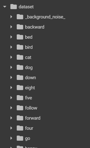 O modelo usa como dataset Speech Commands Dataset que consiste em mais de 105.000 arquivos de áudio no formato WAVE de pessoas dizendo trinta palavras diferentes. Esses dados foram coletados pelo Google e liberados sob uma licença CC B. No dataset está disponível as seguintes palavras: “one”, “two”, “three”, “four”, “five”, “six”, “seven”, “eight”, “nine”, “yes”, “no”, “up”, “down”, “left”, “right”, “on”, “off”, “stop”, “go”, “backward”, “forward”, “follow”, “learn”, “unkown” label are: “bed”, “bird”, “cat”, “dog”, “happy”, “house”, “marvin”, “sheila”, “tree”, “wow”.