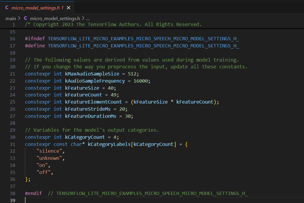 - Em micro_model_settings.h substituta “yes” e “no” por “on” e “off”.