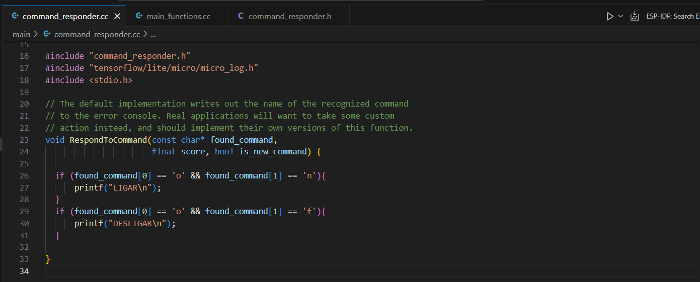 5. Seria interessante que ao identificar algum comando pudéssemos controlar dispositivos, por exemplo, posso ligar luzes. Isso é possível fazer pelo arquivo command_responder.cc. Nele crie a seguinte função: