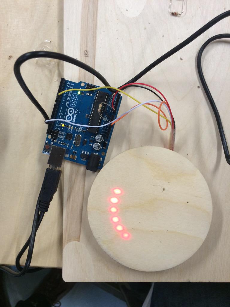 Outra aplicação foi utilizar o Arduino como controlador de um anel de Leds RGB para notificação. A aplicação que desenvolvemos foi um contador de emails lidos/não lidos, associados a uma conta do gmail. Mas é claro que qualquer aplicação conectada à internet e que queira notificar algo em Leds poderia ser desenvolvida. Na Figura 2 podemos observar o efeito dos Leds por debaixo da madeira. Fica muito legal, não? Um vídeo pode ser visto no twitter.
