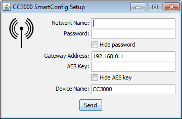 Em tese o Network Name e o Gateway Adress já devem vir preenchidos. Caso não seja o caso, preencha com os dados de sua rede. Preencha também o Password (se houver) e mude o Device Name para Termometro Wi-Fi. Aperte Send e espere o procedimento do SmartConfig terminar. Se tudo der certo, após o procedimento, o CC3000 irá se conectar à rede configurada, abrir o Socket e começar a fazer broadcast da temperatura.