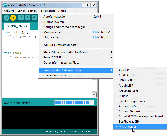 No menu “Ferramentas” opção “Programador” marque “Micronucleus” (Figura 6):