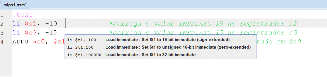 .text li $s1, -10000 #carrega o valor IMEDIATO no registrador s1 ADDIU $s0, $s1, 15000 #soma $s1 com $s2 e armazena o resultado em $s0