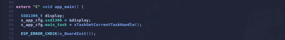 Agora vamos verificar a implementação em alto nível da nossa aplicação. Primeiro, criamos uma instância de SSD1306_t e inicializamos a estrutura s_app_cfg. Então, inicializamos o hardware utilizando a macro ESP_ERROR_CHECK() para verificar o valor de retorno de s_BoardInit(). Em caso de falha na inicialização do hardware, a aplicação irá reiniciar automaticamente e tentar a execução novamente.