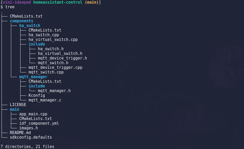 O projeto consiste em dois componentes, mqtt_manager e ha_switch; a aplicação principal, implementada em main/app_main.cpp; e um header file, main/images.h, contendo os bitmaps desenhados no display. Além disso, usamos 2 componentes externos definidos em main/idf_component.yml: protocol_examples_common, da Espressif, para gerenciar o stack de rede e a conexão WiFi, e o nopnop2002/ssd1306 ¹⁰ como driver do display OLED.