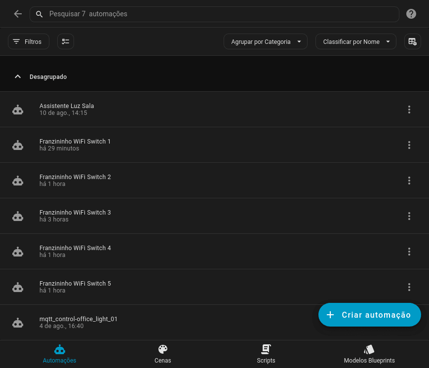 Essa configuração pode ser feita na página Automações e Cenas, acessada via Configurações -> Automações e Cenas: