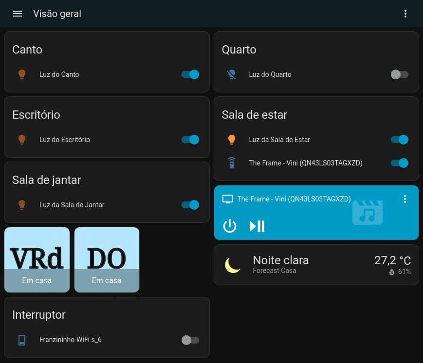 Após a aplicação subir na Franzininho WiFi LAB01, já devemos observar uma entrada do tipo Interruptor com nome Franzininho-WiFi s_6 na página Visão Geral do Home Assistant: