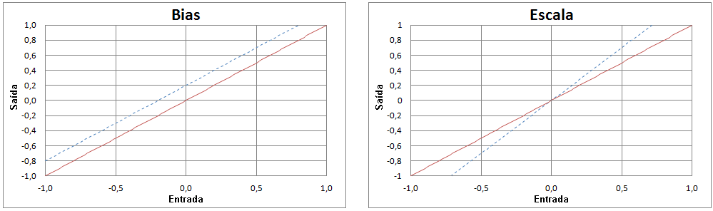 Em todas as ilustrações, a linha azul tracejada representa o valor medido pelo sensor, ao passo que a linha vermelha contínua representa a grandeza real. Vale ressaltar que nem todos estes fatores precisam ser corrigidos. Muitas vezes, apenas o bias e a escala são significantes. Sendo assim, podemos desconsiderar os demais.