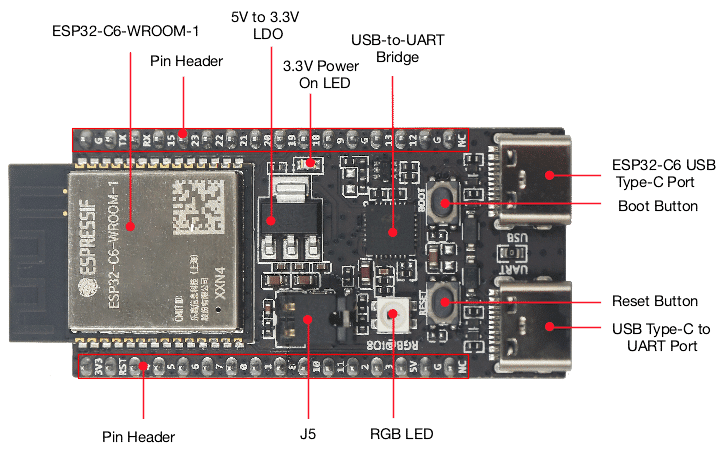 O ESP32-C6-DevKitC-1 é uma placa de desenvolvimento baseada no módulo ESP32-C6-WROOM-1 ou no ESP32-C6-WROOM-1U. Ambos são módulos de uso geral com 8 MB de memória flash SPI. A principal diferença entre eles está na antena: o ESP32-C6-WROOM-1 possui antena PCB integrada, enquanto o ESP32-C6-WROOM-1U conta com um conector para antena externa. Existem algumas variações desses módulos quanto à capacidade de memória flash, conforme mostrado aqui.