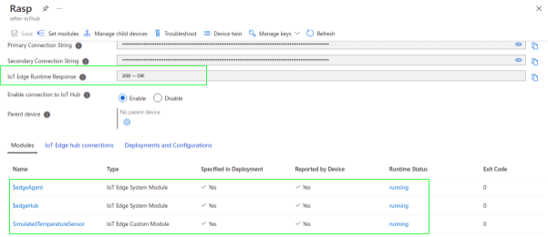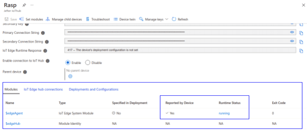 Para finalizarmos a etapa de deployment, clique em create. Você será redirecionado para a página inicial do dispositivo. Aguarde um momento e atualize até que o status dos módulos estejam Running como na imagem a seguir:
