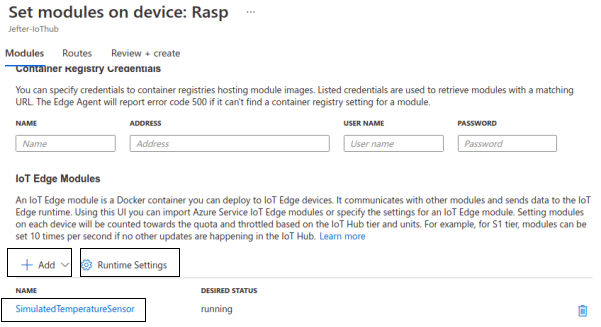 A partir da última janela, clique em Set Modules (na barra de navegação na parte superior da tela). Vá na seção IoT Edge Modules, clique em Add e selecione a opção Marketplace Module para buscar uma imagem do Marketplace. Digite Simulated na janela de busca e selecione o módulo Simulated Temperature Sensor.