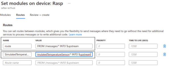 Observe na imagem a seguir que temos duas rotas já pré-configuradas. A primeira é a padrão e direciona todas as mensagens de qualquer módulo emissor de mensagens para $upstream, que é o IoT Hub. A segunda rota foi criada automaticamente quando selecionamos o módulo de simulação do Marketplace e direciona o que vem deste módulo para o IoT Hub. Como essas rotas acabam sendo redundantes, podemos excluir a primeira clicando no ícone da lixeira ao lado da rota.
