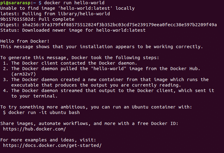 Use o seguinte comando para fazer o download de uma imagem de teste chamada “hello-world” e executá-la para confirmar que o docker está funcional: