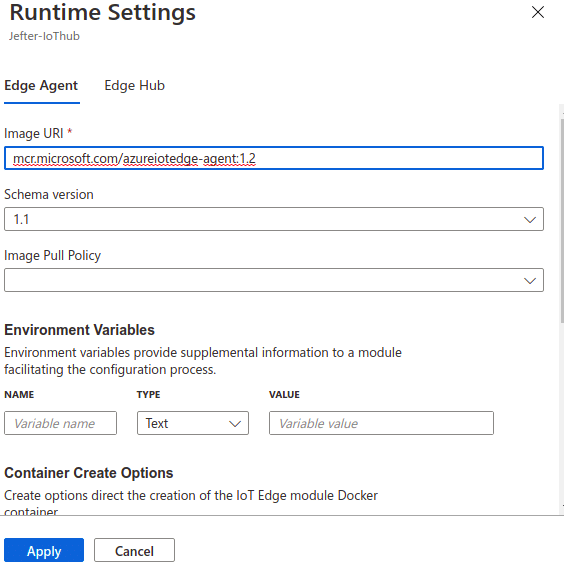 Ainda, na mesma seção IoT Edge Modules, clique em “Runtime Settings” e modifique a versão dos módulos Edge Agent e Edge Hub para 1.2, que é a mais recente. Aplique as mudanças em seguida.