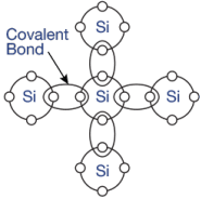 Cada elétron na camada externa de valência de um átomo de silício se ligará a um elétron de outro átomo de silício, formando pares mantidos por ligações covalentes.