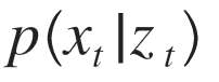 A pequena função p é chamada de função de densidade de probabilidade ou comicamente abreviada por FDP. Essa em especifico nos diz que se trata da probabilidade de um dado valor xt (medida esperada) recair sobre um intervalo de valores zt (valor reportado pelo sensor), ou seja, quanto maior a probabilidade, menor será o grau de incerteza da medida reportada pela infraestrutura de sensoriamento.
