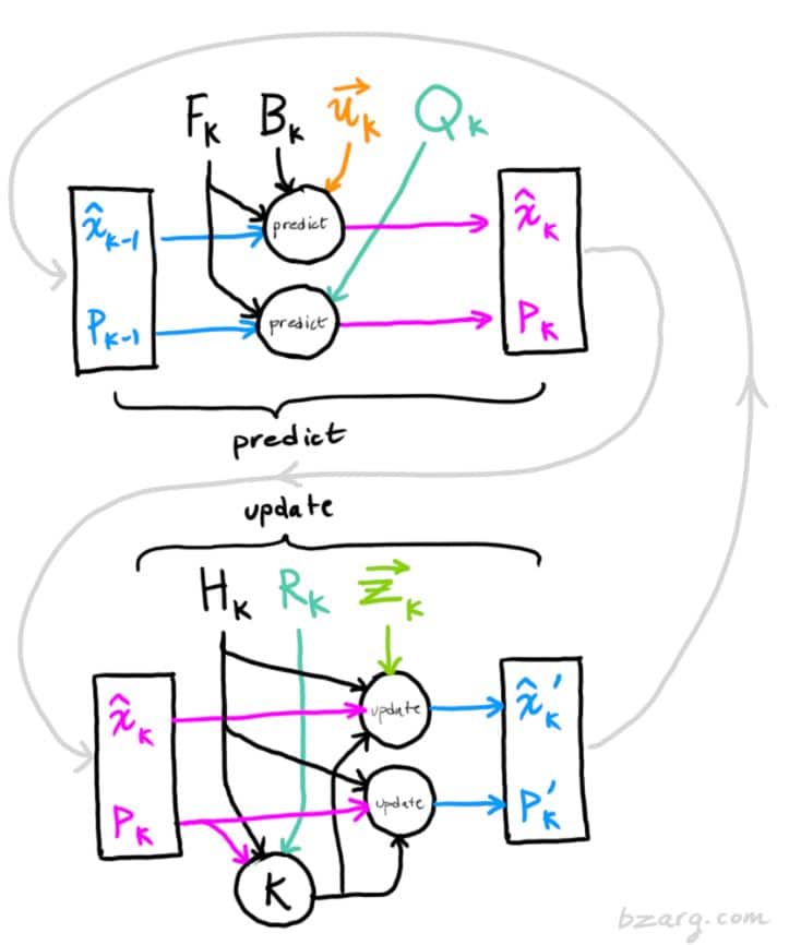 Entendam os vetores xk e pk como sendo o modelo a ser estimado, o sufixo k denota que o sistema encontra-se discretizado (amostras separadas por intervalos de tempo iguais e conhecidos), ou seja, possuímos xk-1 e pk-1 que denotam o último estado corrigido do sistema. Essas variáveis são devolvidas a uma das entradas do filtro, e passam pelo seu primeiro passo de execução, a predição que vai estimar através de estados passados (Regra de Bayes) qual pode ser uma possibilidade de estado futuro.