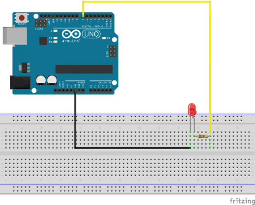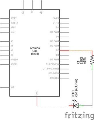 Uma aplicação muito simples que podemos fazer o LED piscar. É o ‘hello World’ do IoT. O ponto que quero destacar é a corrente que fluirá pela porta digital do Arduíno. Essa porta permite uma corrente de até 40 (mA), e se calcularmos para o nosso caso teremos: IPINO7 = [5 (V) – 2,0 (V)] / 150 (Ω) = 20 (mA). Estimei uma queda de tensão de 2,0 (V) sobre o LED, quando o mesmo estiver conduzindo, então, o restante da tensão ficaria sobre o resistor, portanto, limitando a corrente em aproximadamente 20 (mA).