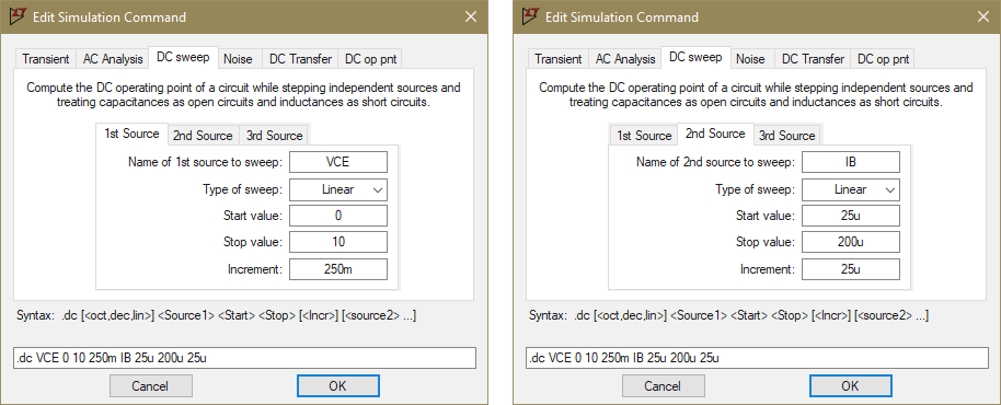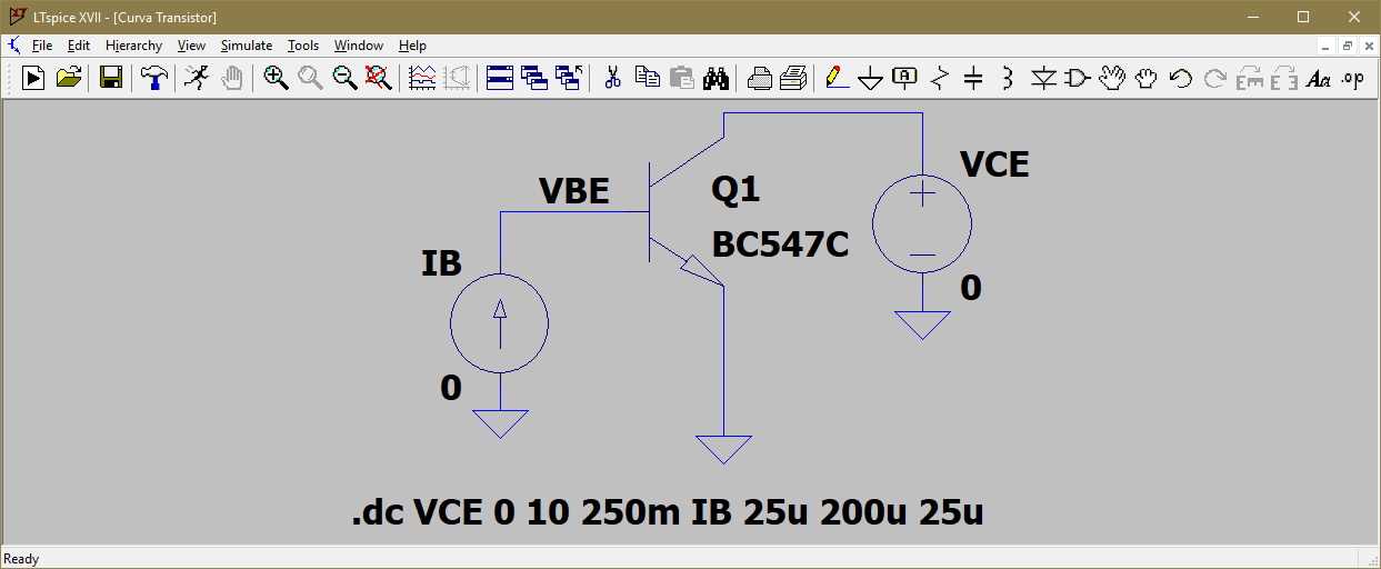 Depois clique no botão ‘OK’. Basicamente estamos polarizando o Transistor BC547C com fontes de corrente e tensão que variam para extrairmos as curvas. A fonte de tensão variará de 0 à 10 (V), com passos de 250 (mV). A fonte de corrente variará de 25 (uA) à 200 (uA), com passos de 25 (uA).