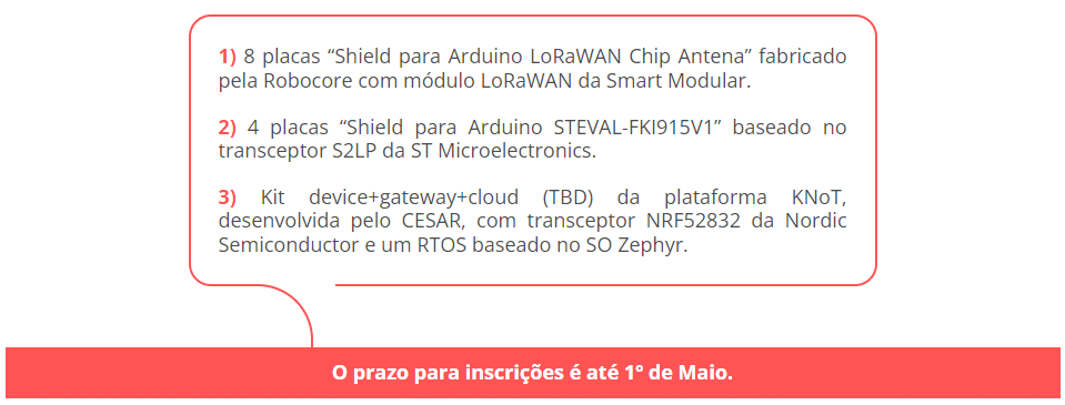 As 8 melhores equipes classificadas na primeira etapa ganharão kits de desenvolvimento ou shields para Arduino com os módulos LoRaWAN da SMART SMART Modular Technologies ou do S2LP, rádio sub-GHz da STMicroelectronics.