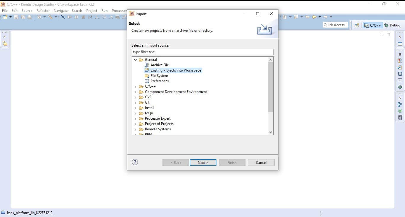 Abra o KDS. Clique em File e em seguida clique em Import, assim a janela Import poderá ser vista na sequência. Abra o item General, selecione a opção Existing Projects into Workspace, e em seguida clique em Next. A janela Import apresentará outras opções, deste modo, selecione a opção Select root directory, clique em Browse, selecione o diretório do microcontrolador da Freedom Board (\Freescale\KSDK_1.3.0\lib\ksdk_platform_lib\kds\K22F51212). Em seguida, clique em Finish.