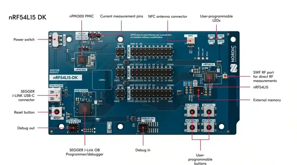 O kit de desenvolvimento nRF54L15 foi criado para a criação de projetos com o nRF54L05, um Sistema em Chip (SoC) sem fio que pode ser usado em diversas aplicações como jogos, realidade virtual e aumentada, casas inteligentes, equipamentos médicos e IoT industrial.