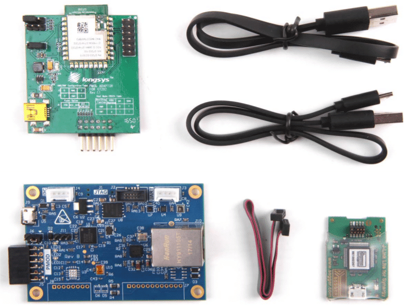 Além disso, acompanham 3 cabos para interconexão das placas e para permitir operação, dois cabos USB e um cabo de debug para 10 pinos padrão miniJTAG. Veja a imagem abaixo que ilustra todos os itens do kit.