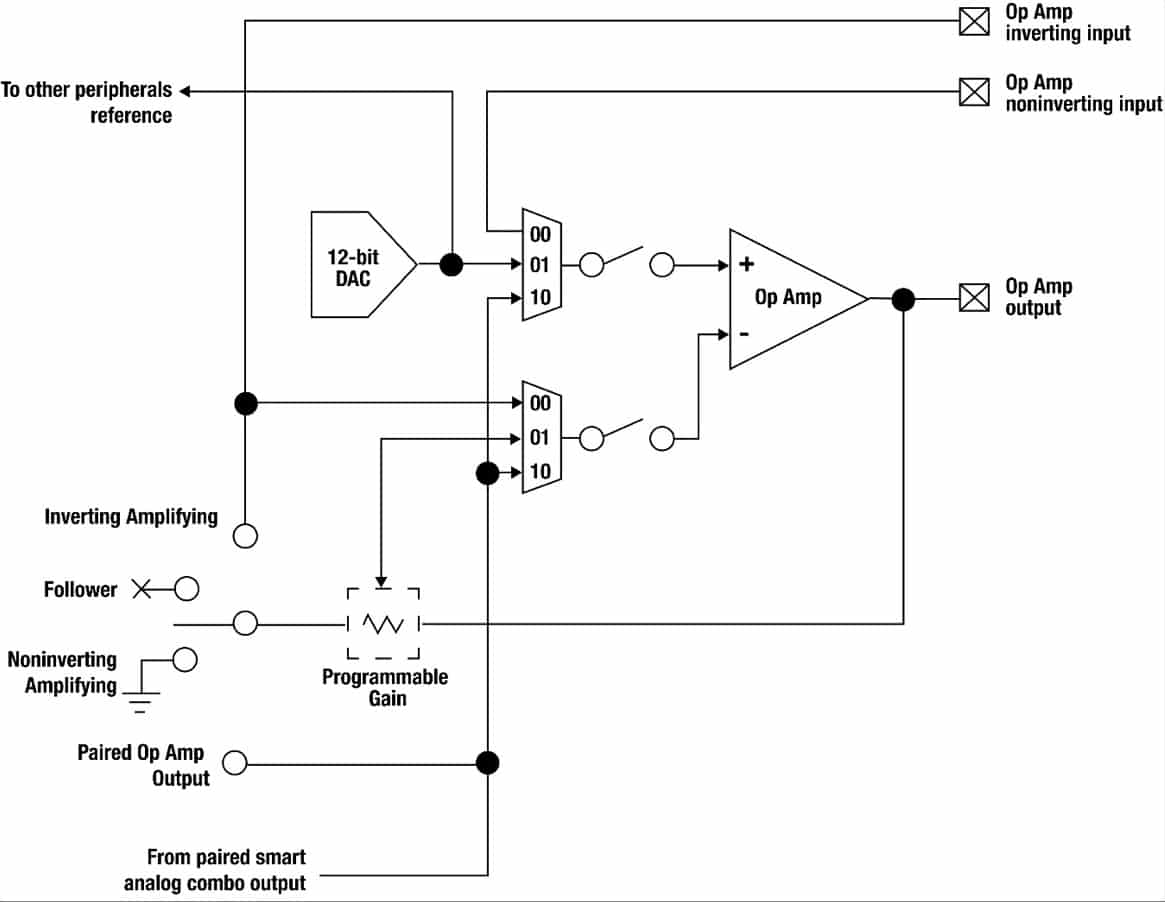 É justamente neste último item que está o periférico mais interessante, o SAC, um acrônimo para Smart Analog Combo. O SAC pode conter um amplificador operacional rail-to-rail que pode ser utilizado como um PGA (Programmable Gain Amplifier), um DAC de 12 bits e roteamento de sinais internos ou mesmo externos, conforme a figura a seguir.